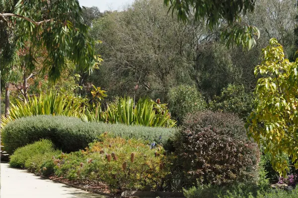During the Millennium Drought, this display was created to start conversations with visitors about water use to demonstrate ways to create a beautiful garden with little to no irrigation. This garden is divided into three tiers, demonstrating three different watering regimes (hydrozones); from the open and arid top terrace with no irrigation, down to the bottom terrace displaying plants with a more lush appearance that still requires very little watering.Â