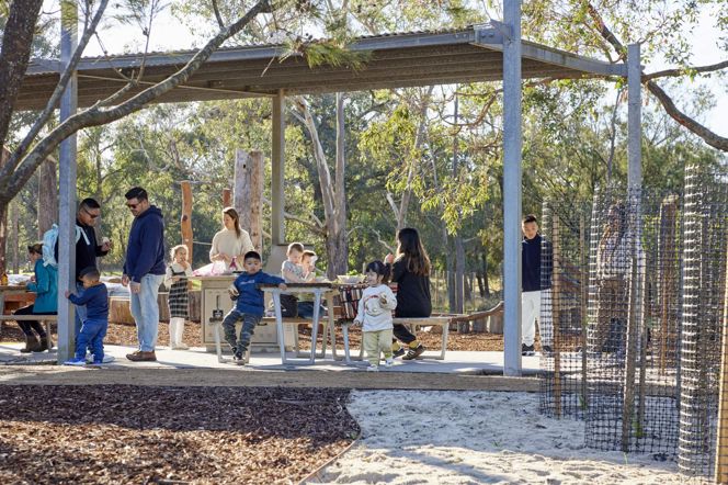 The playground’s features include sandpits, giant logs, swings, climbing ropes, a fallen tree, giant banksia cross-sections which collect puddles, basalt stone seats/tables, possum prints and “insect doors and hotels”. It is situated next to a large, covered BBQ facility with picnic tables, where people of all cultures can enjoy the space while supervising children.